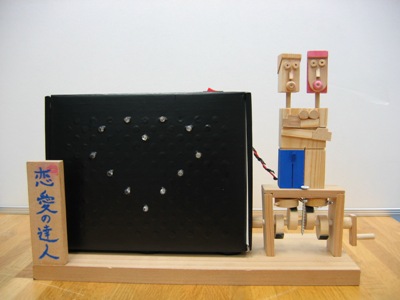 写真は「恋愛の達人」です。人形の右下のハンドルを回すと顔が向き合いキスをします。するとハートの形をした星が光るというものです。
