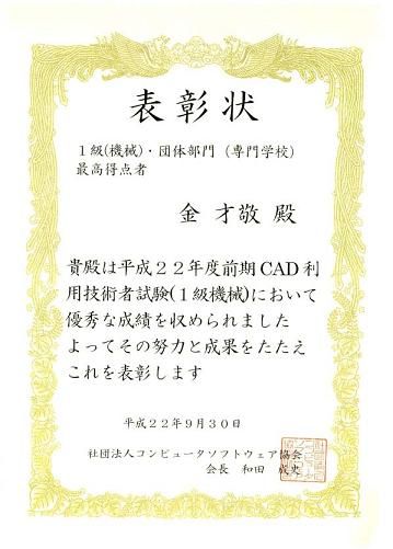 6月に実施されました「CAD利用技術者1級(機械)」において、本校より2名(蒲田キャンパス1名、八王子キャンパス1名)の学生が、専門学校部門の最高得点者(正解率 総合99.3%、筆記100%、実技99.1%)として、試験主催者(社団法人コンピュータソフトウェア協会)より優秀表彰を授与されました。同部門を「日本工学院」で独占しました