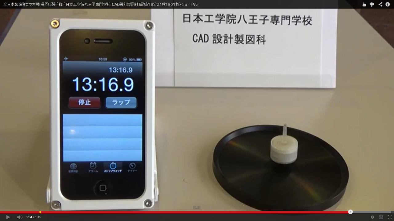 昨年、11月16日に本校八王子キャンパスで行われた「コマ大戦 プレ世界大会 in 八王子」単独回転時間部門で優勝した日本工学院八王子専門学校CAD設計製図科(現l機械設計科)Aチームの記録ですが、その後、単独回転部門が「スタンダード」と「メカニカル」の2つに別れたため、新たに「メカニカル」の種目にノミネートされ、現在2位をキープしていることがわかりました。今後は電力や磁力などを組み込んだタイプのコマは「メカニカル」に分類されるそうですが、まだ、あまりエントリーするチームがいないのが現状のようです。大会に出場しなくても、コマの動画を撮影し、YouTubeにアップすればエントリーできます。